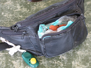 I attach a clicker to my belt, close to the pouch containing food rewards. In this way I can give a command, click and reward in very close succession. It's a process that's working well for me and my dog.
